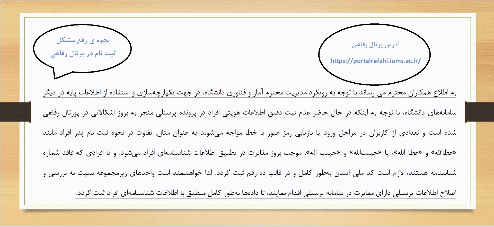 به اطلاع همکاران محترم می رساند با توجه به رویکرد مدیریت محترم آمار و فناوری دانشگاه، در جهت یکپارچهسازی و استفاده از اطلاعات پایه در دیگر سامانههای دانشگاه، با توجه به اینکه در حال حاضر عدم ثبت دقیق اطلاعات هویتی افراد در پرونده پرسنلی منجر به بروز اشکالاتی در پورتال رفاهی شده است و تعدادی از کاربران در مراحل ورود یا بازیابی رمز عبور با خطا مواجه میشوند به عنوان مثال، تفاوت در نحوه ثبت نام پدر افراد مانند "عطاالله" و "عطا الله" ، یا "حبیبالله" و "حبیب اله"، موجب بروز مغایرت در تطبیق اطلاعات شناسنامهای افراد میشود. و یا افرادی که فاقد شماره شناسنامه هستند، لازم است کد ملی ایشان بهطور کامل و در قالب ده رقم ثبت گردد. لذا خواهشمند است واحدهای زیرمجموعه نسبت به بررسی و اصلاح اطلاعات پرسنلی دارای مغایرت در سامانه پرسنلی اقدام نمایند، تا دادهها بهطور کامل منطبق با اطلاعات شناسنامهای افراد ثبت گردد.